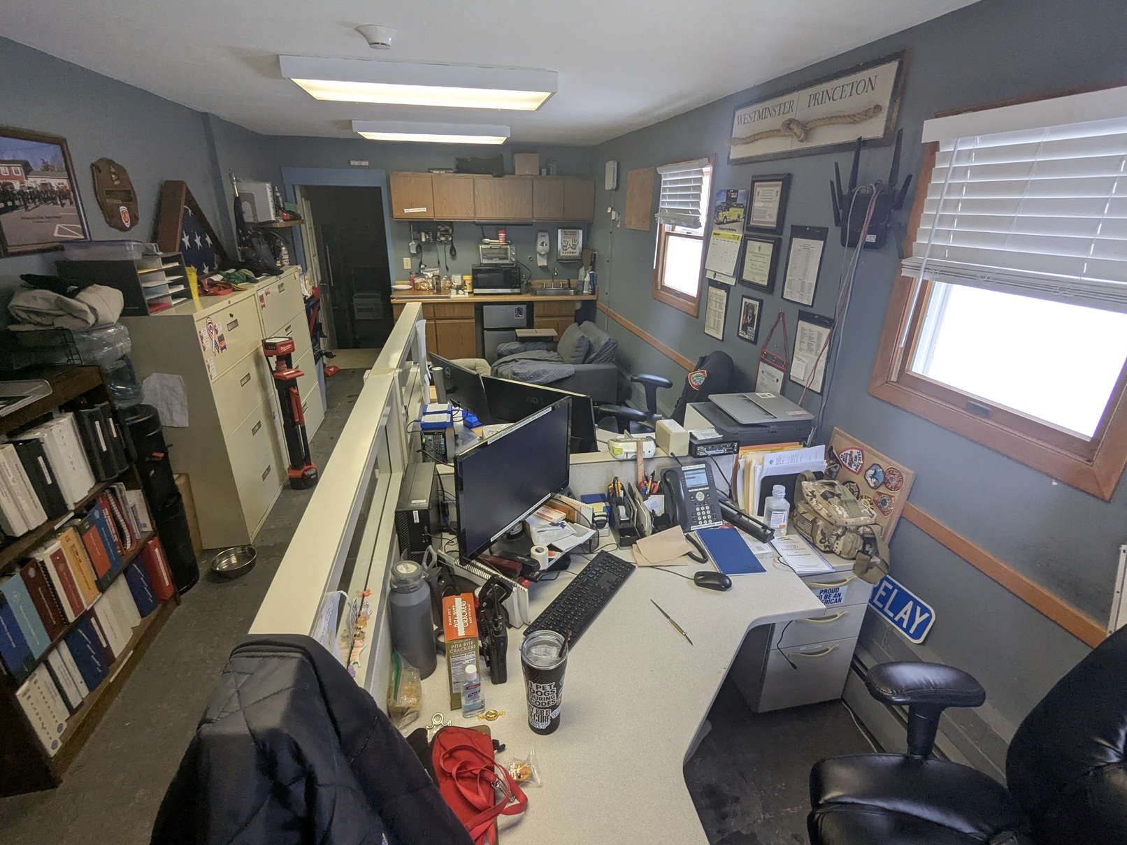 This is the total space for the fire chief and day crew of two people. The available area is little more than a large closet. The chief has no privacy when working with confidential info, the single remaining desk must be shared with the other two day-shift crew.