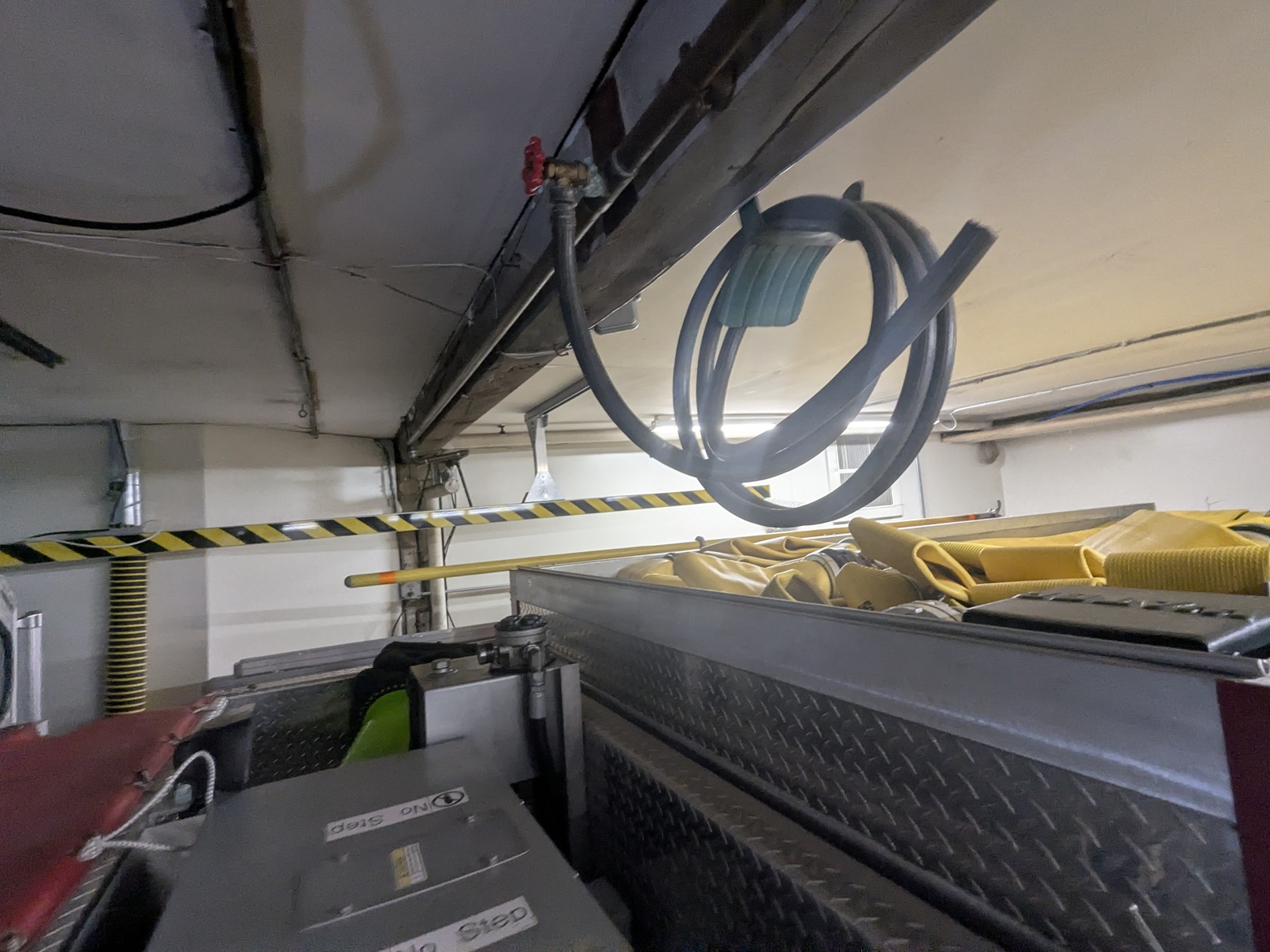 This is an unsafe and potentialy liablous working area. There is no space to clean, pack hose, perform maintenance, etc. Trucks must be moved out of the bay, even in the winter.